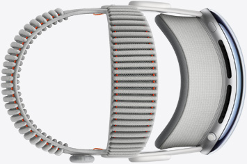 Side view of Apple Vision Pro, aluminum alloy frame, assembled with Light Seal, Audio Straps, and Dual Knit Band