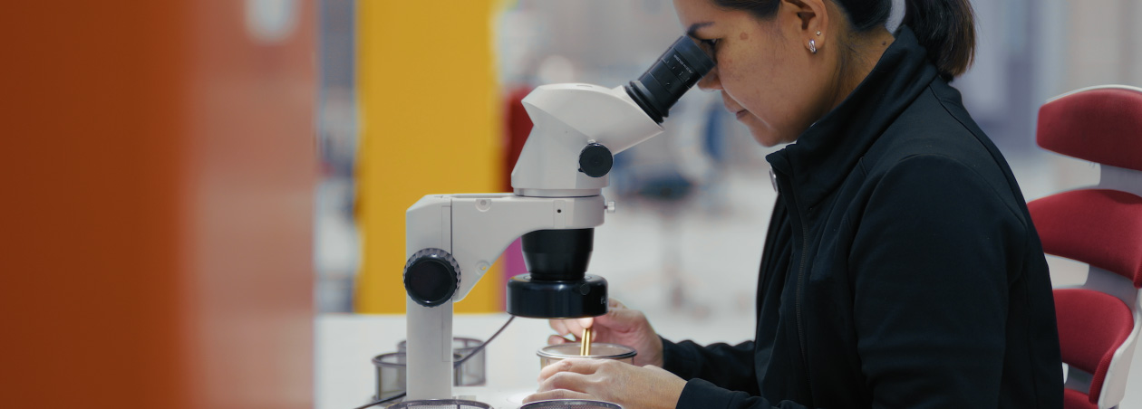 A worker wearing safety glasses inspects a glass component in an assembly facility